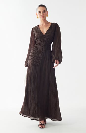 The Palamino Dress by WILLA is a woven maxi-length dress that exudes refined elegance with a modern twist. Crafted from a soft lyocell and viscose blend, this semi-sheer dress features a flattering V neckline and full-length elasticated cuff balloon sleeves for a touch of drama.