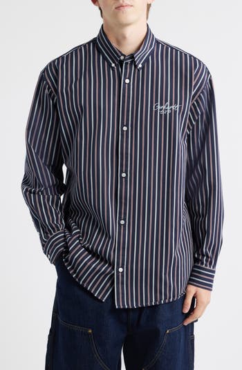 This sharp-looking button-down sport shirt features zippy stripes and is made from soft, durable cotton twill and finished with scripted brand embroidery on the chest.