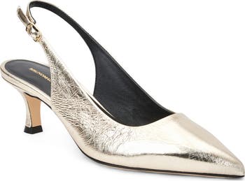 A pointy toe elongates the profile of an Italian leather pump featuring a tapered kitten heel and adjustable slingback strap.