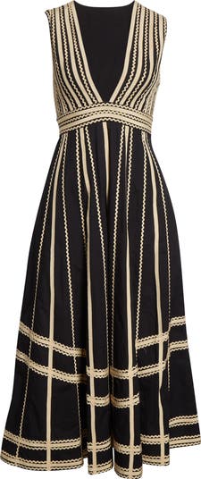 Detailed with ric-rac trim and grosgrain ribbon, this dress is defined by its plunging neckline and A-line silhouette. Crafted from crisp cotton, it floats away from the body with an easy architectural shape for a result that's both artful and effortless.