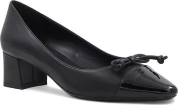 A pointy cap toe topped with a playful bow adds vintage-inspired charm to a weatherproof leather bootie lifted by a wrapped block heel.