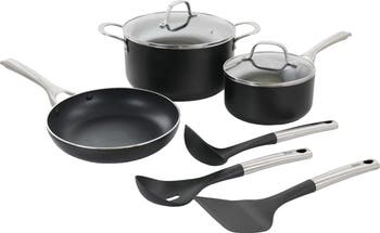 Complete your cookware collection with the Oster Palladium 8 Piece Aluminum Cookware Set in Black. This full set offers you all the tool you need from One 6Qt. Dutch Oven, One 6Qt. Dutch Oven Lid, One 2.5Qt. Saucepan, One 2.5Qt. Saucepan Lid, One 9.5" Frying Pan, One Ladle, One Turner, and One Slotted Spoon. This collection is crafted from heavy gauge aluminum for strength and durability. The stove top items are also equipped with an induction ready base and are also compatible with Gas, Halogen, Electric, and Vitroceramic. This set also comes with paired, vented tempered glass lids for monitoring your cooking process. The utensil's double-riveted stainless steel handles will keep cool while you prepare your meals. Components of this collection are dishwasher safe to allow for easy cleaning and everyday use.