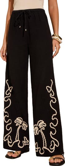 Cut from breezy cotton, these comfy tie-waist pants are accented with rickrack palms and flowy wide hems.