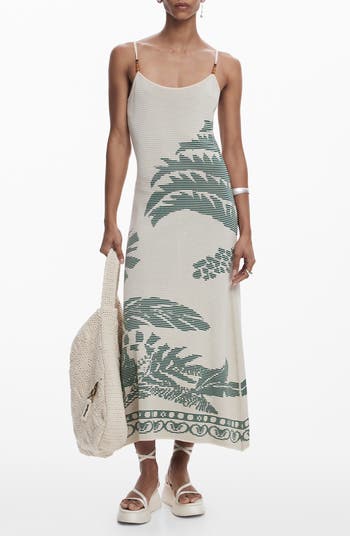 Complete your vacaye packing list with a summery sweater dress textured in leafy palms and hung from beaded straps.