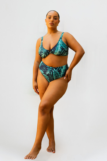 Turn heads this summer with our plus size, high-waisted bikini. This set combines style and comfort with a supportive knotted top and flattering high-rise bottoms. Perfect for beach days or poolside lounging, this bikini hugs your curves while offering confident coverage and a chic, tropical vibe.
