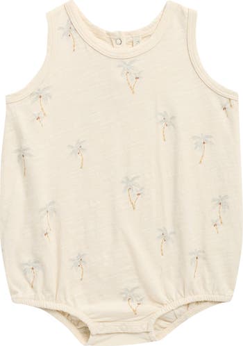 A breezy palm print enhances the charm of a cotton bubble bodysuit secured with convenient snaps for easy changes.