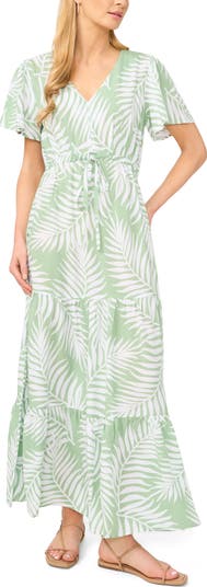 Vacation vibes define an easygoing maxi patterned in palm fronds and gently cinched at the waist.