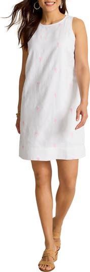 Petite pink palm trees follow along as you sashay by the beach or through your weekend errands in this simply styled dress cut to show your arms to the sun from cool, breathable linen.