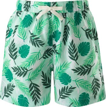 - Featuring a stylish palm tree print on pale green base, an elastic waistband with a decorative herringbone cord tie, and a button-down patch pocket at the back, your little one will be stylish and comfortable while having a blast in the water.