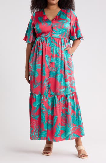 Satin fabrication gives soft shine to your every movement in this buttoned maxi dress patterned in summery fronds that make it a perfect choice for warm-weather getaways.