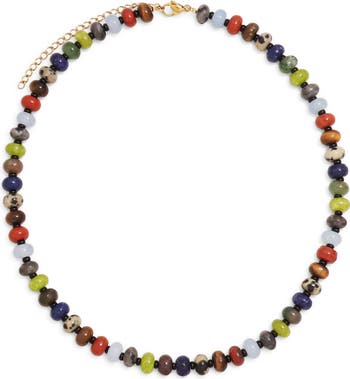 This handcrafted beaded necklace brings bold color and texture to your neckline with a mix of quartz and synthetic stones.