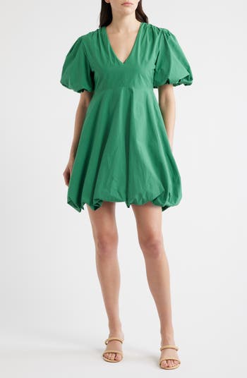 Puff sleeves frame this crisp cotton poplin dress fashioned with soft bubble hems at both the cuffs and skirt for fabulous volume.