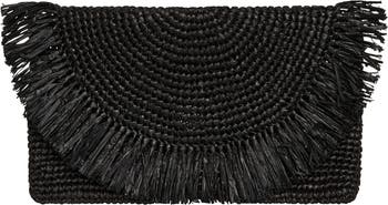 Swingy fringe amplifies the resort-worthy appeal of a slender clutch shaped from handwoven raffia and the perfect accessory for your next weekend getaway.
