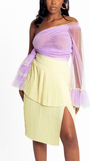 - Fabric & Fit: 100% polyester; one-shoulder neckline; side tie closure; sheer finish