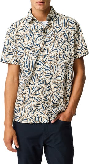 Palm leafs are strewn cross an all-cotton button-up shirt fashioned with short sleeves and a straight hem that looks great untucked.