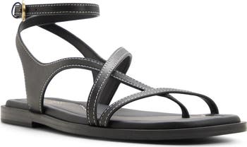 Aged-finish hardware and refined oiled-edge detailing bring dimension to the strappy silhouette of a leather sandal grounded by a foam-cushioned footbed and flexible rubber sole.