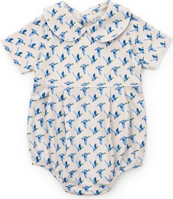 Boys' peter pan collar short sleeve pima bubble. Contrast piping on collar, sleeve and waist. Button closure in back and three snaps in the stride.Made from 100% Peruvian Cotton.