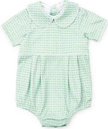 Boys' peter pan collar short sleeve pima bubble. Contrast piping on collar, sleeve and waist. Button closure in back and three snaps in the stride. Made from 100% Peruvian Cotton.