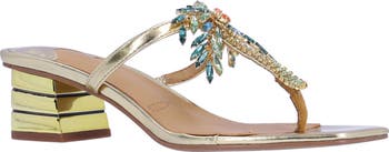 A sparkling palm tree on the T-strap adds a tropical twist to this metallic, block-heel sandal.