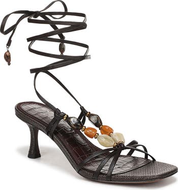 Polished hardware and decorative stones add a boho aesthetic to a strappy sandal featuring a tapered heel and slender ties that wrap around the ankle.