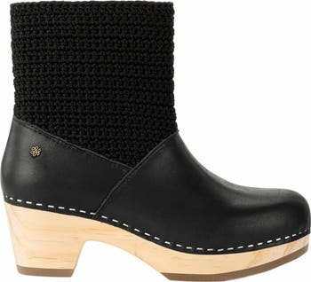 Style and comfort combine with these boots. They feature classic clog styling with a mixed hand-crochet and leather upper, perfect for styling with or without socks for casual-cool looks. Elevated on a wooden heal and secured with an exposed back zip.