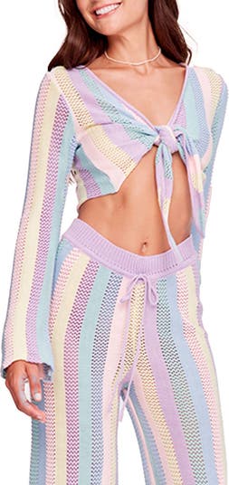 Cover up after your swim in this vibrant, crocheted, cropped sweater that's styled with front ties and bright strips.