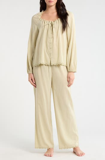 A supersoft organic-cotton blend keeps you feeling comfortable in these relaxed-fit pajamas featuring eyelet-detailed lace trim with sweet scalloped edges.
