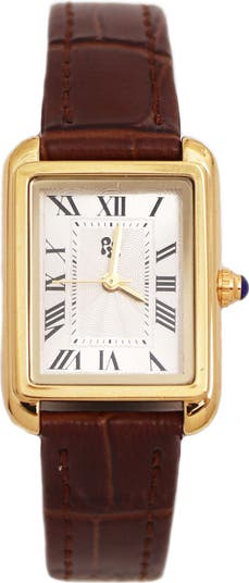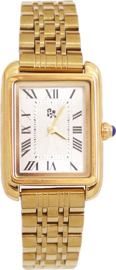 Roman numeral markers add to the timeless appeal of a sleek rectangular watch finished with a high-shine goldtone plate.