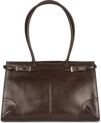 A buckled strap encircles the topline and highlights the structured profile of a spacious leather satchel suspended from elongated top handles for comfortable wear.