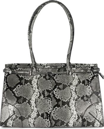 A buckled strap encircles the topline and highlights the structured profile of a spacious leather satchel suspended from elongated top handles for comfortable wear.