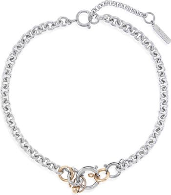 Inspired by glam rock and hardware-heavy punk influences, this statement choker is handcrafted from palladium-dipped chain links pierced with rings and barbells dipped in 24-karat gold.