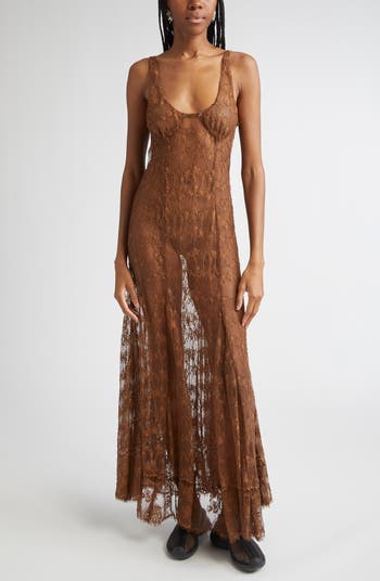 Hillary Taymour's perennial nature fascination springs forth in this ever-enchanting midi dress fashioned from sheer floral lace—a repeated motif from her 'Touch Grass' collection. Godets add soft volume at the skirt, enhancing the captivating sway with your every step.