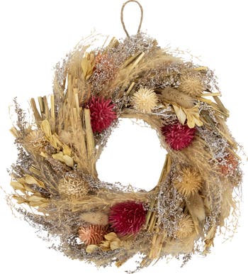 Capture the essence of nature with autumn wreath. Adorned with delicate pampas grass, grains of wheat and barley, and an array of dried blossoms in soothing shades of red, pink, and beige, this wreath brings a touch of rustic elegance to your space. Embrace the simplicity of nature's beauty with this charming and timeless decor piece. Product Features: Pampas grass fall wreath Accented with mixed floral blooms No assembly required - wreath comes in 1 piece Flat foam backing Comes ready to hang with a jute cord Recommended for indoor use - if using outdoors place under a covered area Dimensions: 11" diameter (measured from outermost edge to outermost edge across the wreath) Material(s): polyester/wood/foam/jute