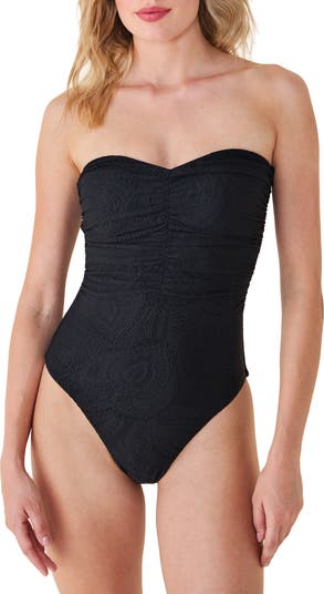 Shirred details highlight your shape as you lounge by the water in this strapless one-piece swimsuit given textural dimension from stretchy paisley-jacquard fabric.