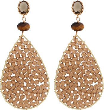 Wire-wrapped crystals fill the large teardrop silhouette ot these light-catching earrings featuring tiger's eye stones for added organic beauty.