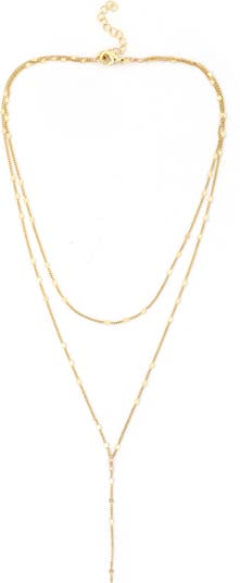Shiny coins punctuate the delicate chain of this layered Y-necklace in a glinting 14-karat gold plate.