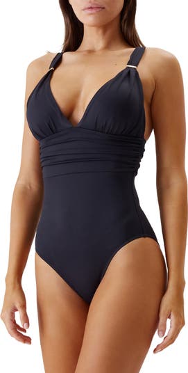 Goldtone slider details lend adjustability to this ruched one-piece swimsuit.