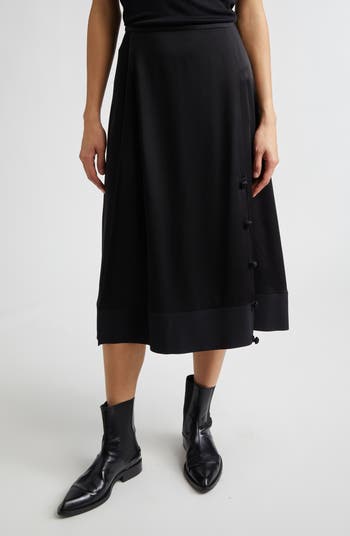 The label's minimalist luxury and understated elegance endure in this panelled skirt with a stride-friendly front slit anchored by a row of tonal buttons.