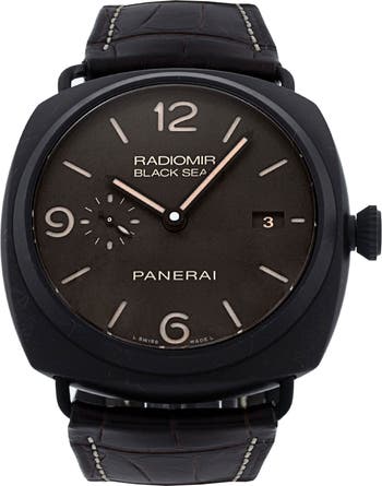 Timeless style and reliable functionality come together in this preowned watch with a crisp Radiomir dial in homage to the piece's Italian naval roots. A matte carbon case and croc-embossed leather strap complete the vintage-inspired minimalism of this iconic timepiece.