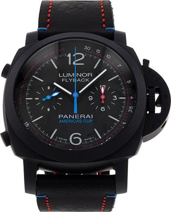 Colorful hands and matching stitching on the leather strap set apart this automatic-powered, preowned Swiss-made watch crafted to perfection in a lightweight ceramic case.