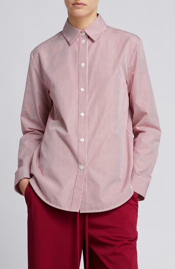 Crisp stripes play up the preppy style of this button-front shirt in a lightweight cotton weave.