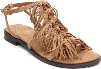 Hardware details add a wink of light to this suede sandal that kicks up movement with tiers of playful fringe.
