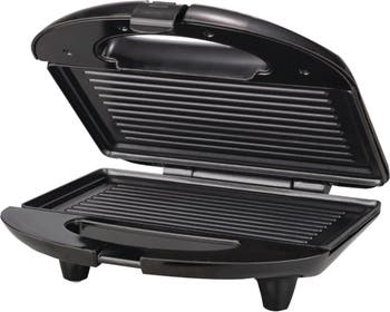 Use the powerful 750 watt Brentwood TS-246 Non-Stick Panini Press and Sandwich Maker to cook 1 to 2 sandwiches in just minutes. Plates heat up fast and even for perfect grill lines. Paninis slide right off the non-stick grill plates. Convenient power and preheat indicator lights illuminate when unit is on and plates are hot and ready. Non-skid feet keep the unit secure in place. Handles and housing are cool to the touch for added safety. Integrated handles lock for easy carry. Panini press stands upright with cord wrap for easy storage. Glossy black finish with brushed stainless steel accent complements every countertop.