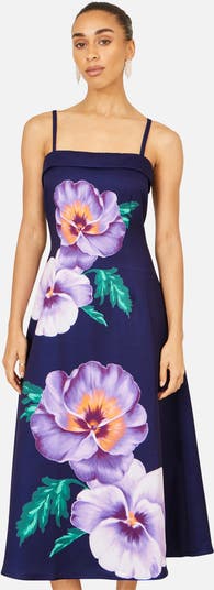This striking dress is designed to make a statement with minimal effort. Featuring a sleek, sleeveless silhouette with slim straps, it falls into a softly flared skirt that moves beautifully as you walk. The bold placement floral print adds a dramatic, artistic touch, set against a deep, elegant base for a refined finish. Perfect for special occasions, evening events or summer celebrations, this dress combines modern elegance with standout style.