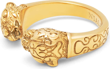 Panther-inspired ring designed to evoke the elegance and strength of jungle wildlife. Features high-grade stainless steel with 18k gold plating. The panther is recognized as a symbol of protection, courage, and guardianship in various cultures. Each piece is individually handcrafted and may vary slightly in size, shape, and color.