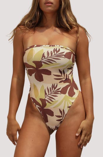 A macramé back lend boho flair to this splash-ready one-piece swimsuit featuring a strapless silhouette and vacay-approved pattern.