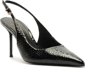 Croc-embossed leather highlights the striking silhouette of this pointy-toe slingback pump set on a svelte stiletto heel.