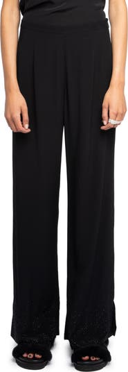 Sparkling crystals at the hems add an extra flash of glamour to these wide-leg pants that are ready for your next night out.