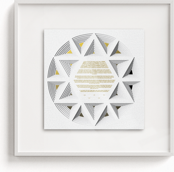 The Star of David is one of Judaism's most recognized symbols. The Paper Star makes it feel completely new. Designed by Noelia Lozano — a Spain-based paper artist known for her meticulous, sculptural approach — the original artwork is built from eight individually hand-cut sheets of premium rag card, each layer adding dimension and shadow, all backed with gold foil that catches the light as the piece shifts. The result is a Magen David that feels alive: geometric, dynamic, and genuinely striking. Your ketubah is a fine art archival print of Noelia's original, faithfully reproduced to capture the depth and dimension of the sculptural source work. Fill-in-the-Blank: Select one of our standard texts, with names, date and location filled in by hand.