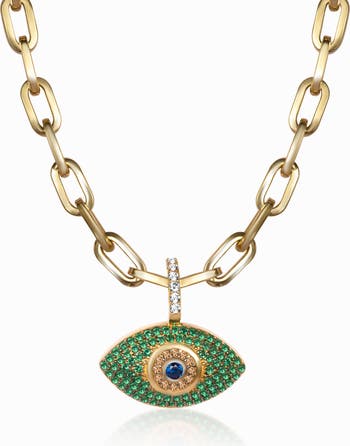 A modern take on a timeless symbol of protection, this necklace features a bold gold chain with a sparkling green encrusted evil eye pendant. The shimmering diamonds on the bail add extra brilliance, making this piece as powerful as it is stylish. Wear it solo for impact or layer with delicate chains for a trendy stacked look!